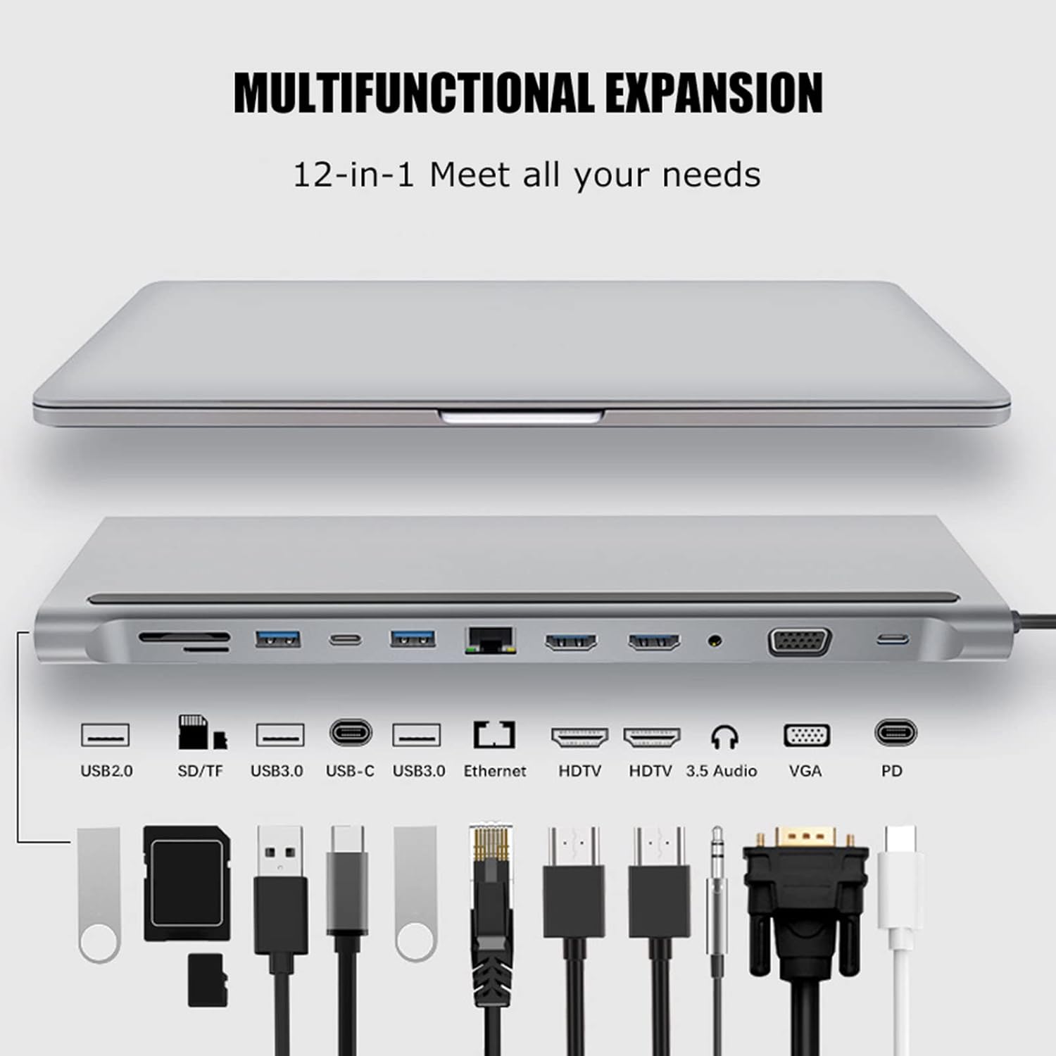 Specifications: Item Type: 12 in 1 Docking Station Material: Aluminum Alloy Interface: 2 x USB3.0, 1 x USB2.0, 2 x HDMI, 1 x VGA interface, 1 x PD interface, 1 x 3.5 mm interface, 1 x small memory card, 1 x memory card, 1 x RJ45 interface, 1 x Type-C interface RJ45: 100M Ethernet port is backward compatible USB: 2 x USB3.0, 1 x USB2.0 HDMI: 2 x 4K HD VGA: HD 1080P PD: up to 87 W, backward compatibility Audio: approx. 3.5 mm/0.1 inch audio interface Two card slots: memory card/small memory card Packing list: 1 x 12-in-1 docking station Note: Please note that the new type and old type of this product will be sent at random, and make sure you do not mind before ordering.