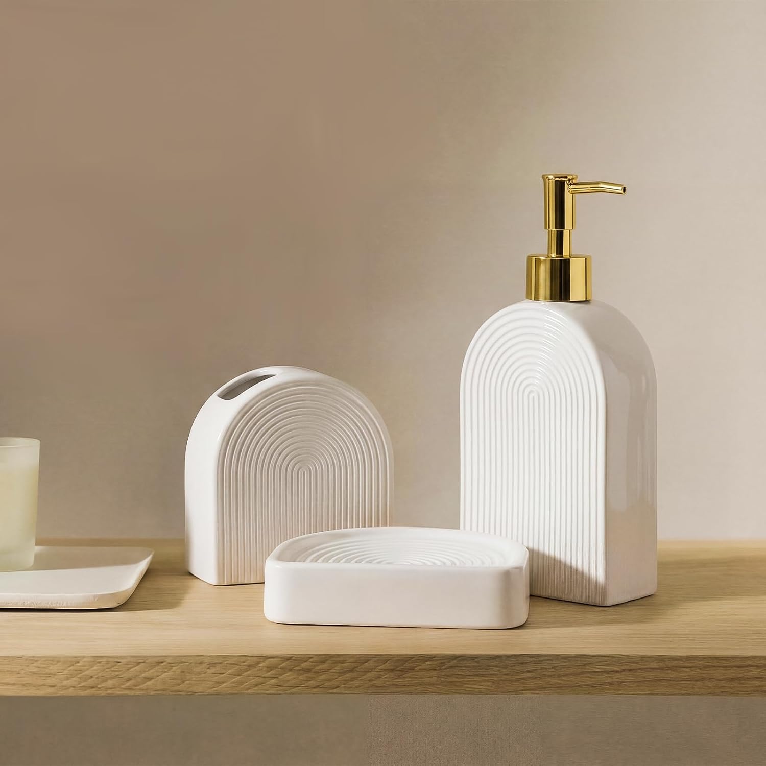 | Included Components | Soap dispenser, toothbrush holder and matching soap dish |