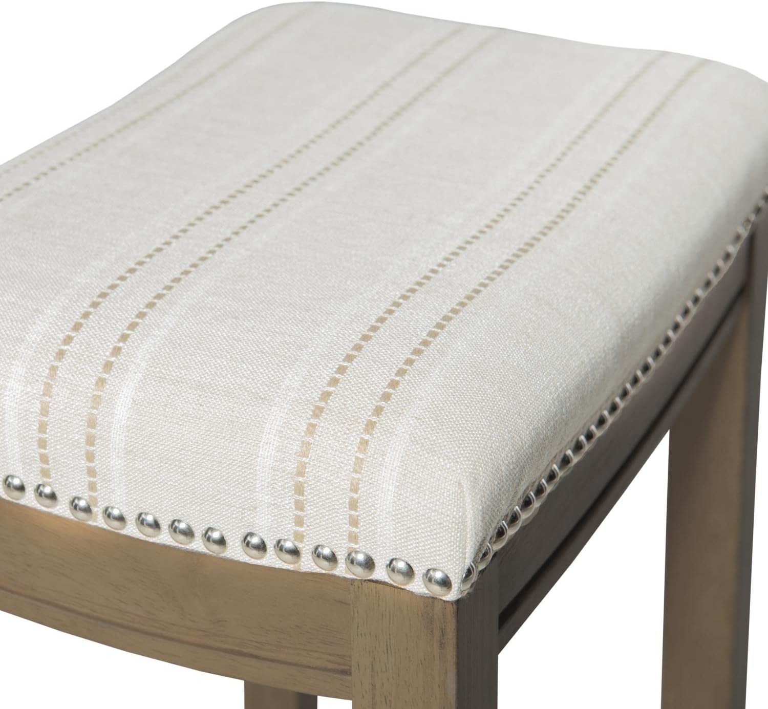 The Claridge Counter Stool will add stylish seating to any counter or high top table. The sturdy wood frame has a rustic brown finish accented by a neutral striped polyester linen blend fabric seat. Brushed silver nailhead trim adds an eyecatching detail. 24" Seat Height. 275 pound weight limit.
